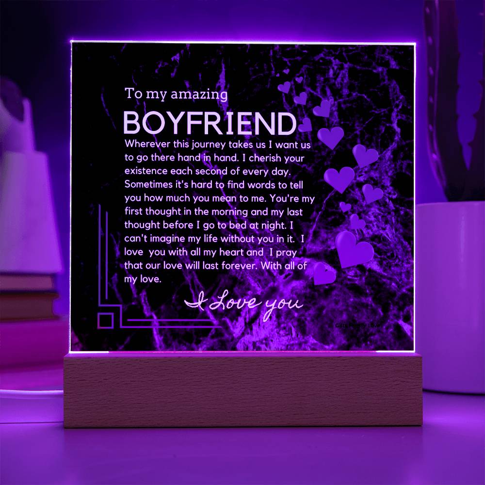 Embrace the opportunity to honor your beloved boyfriend with this extraordinary acrylic plaque. Our dedication to excellence guarantees a product that will be treasured for years to come. Celebrate the love that binds you together and make a profound statement of devotion with this captivating piece of art.